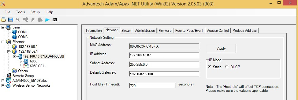 Zum Ausprobieren der Schaltung mit dem ADAM 6050 bietet sich die AdamApax .NET Utility-Software an, die nach dem Start nach den im LAN installierten ADAM 6050 sucht und mit der man die Grundfunktionalität testen kann.